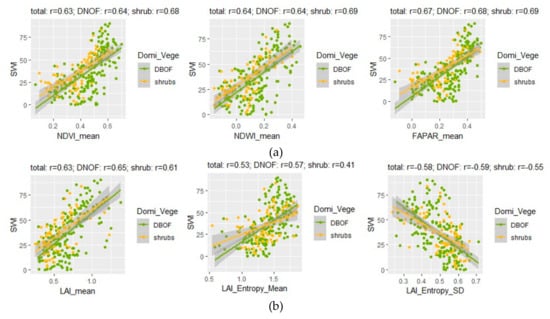Mean plots for all four VIs show a strong positive linear correlation with the SWI (r > 0.60). The shrub-dominant sites indicate a strong correlation with SWI (r > 0.68) in terms of mean NDVI, NDWI, and FAPAR; DBOF-dominant sites also show a strong correlation. Spatial variance described by SD and CV are moderate in correlation strength with SWI for NDVI, NDWI, and FAPAR. The SD of FAPAR shows weak to no correlation with SWI. Second-order entropy in Figure 3 and second-order homogeneity in Table 3 both show weak-to-no correlation except for LAI, where a moderate correlation strength can be observed. This indicates a partial significance of second-order image texture measures in the discussion of vegetation structures relevant indices, such as LAI, over the study area.