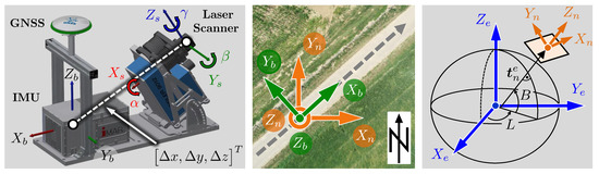 In the context of mobile laser scanning, an object point in the local sensor frame of the 2D laser scanner (s-frame) can be written as , where is the measured distance and the scanning angle. In order to obtain a georeferenced point cloud, the object points of the 2D laser scanner must be transformed into the body-frame of the platform (b-frame), which often coincides with the coordinate system of the IMU. For this transformation, the extrinsic calibration parameters are needed, i.e., the lever arm as well as the boresight angles , , and (Figure 2, left). Subsequently, the orientation angles of the platform, i.e., roll , pitch , and yaw , are used to transform the object points into the navigation-frame (n-frame), which is a north-oriented local level frame, whose origin coincides with that of the b-frame (Figure 2, middle). Finally, the object points are transformed to a superordinate earth-fixed and earth-centered coordinate frame, which we denote as e-frame (Figure 2, right), by using ellipsoidal longitude L and latitude B, as well as the translation vector . All these transformations can be combined to the georeferencing equation, which provides georeferenced scan points (MLS: Mobile Laser Scanning):
