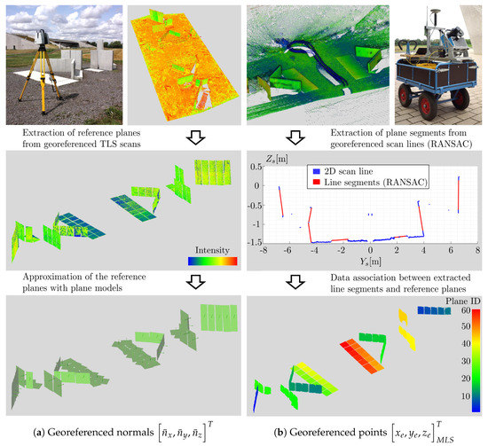 (a) Generating reference normals for the plane setup using TLS (Terrestrial Laser Scanning), (b) Generating a point cloud of the plane setup using the mobile laser scanning system. The scan points of the mobile laser scanning system are automatically extracted from the scan lines using RANSAC (Random Sample Consensus) and assigned to the correct reference plane.