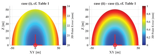 In order to define a target accuracy for the estimated calibration parameters, we performed an error propagation of Equation (2) with optimistic assumptions for the accuracy of the observations. These accuracies were oriented towards empirical values and manufacturer specifications and are summarized in Table 1. Two different scenarios were simulated, i.e., with and without an uncertainty for the calibration parameters. In Table 1, these two scenarios are denoted with cases (i) and (ii). The error propagation was executed in a local frame (l-frame) with east, north, and height component in order to distinguish between horizontal and vertical accuracy. A point grid was generated for the scan profile of the 2D laser scanner with a typical operating range of 50 m. For each grid point, a covariance matrix was calculated via error propagation. Based on this, a 3D point error was derived from the trace of each covariance matrix.
