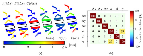 In Figure 6a, we can see that different parameter deviations lead to different patterns of the point-to-plane distances. Thus, making the assumptions that we have no other sources of errors, we can separate erroneous calibration parameters by analyzing their unique deviation patterns. This indicates a good separability of the calibration parameters. The good separability of the calibration parameters is verified by their correlation matrix in Figure 6b, which is derived from the covariance matrix of the parameter estimation (cf. Equation (6)). According to the correlation matrix, the calibration parameters are basically uncorrelated, except for a small correlation of 29% between the boresight angles and . The reason for this correlation is the sequence of boresight rotations using Euler angles. Due to the = 30 tilt of the 2D laser scanner (cf. Figure 2, left), the horizontal projection of the -axis is smaller than the length of the -axis. In the extreme case of = 90, the projection is zero. In navigation, this phenomenon is known as gimbal lock [24], where the boresight angles and rotate around the same axis and cannot be separated from each other (100 % correlation). Thus, in the case of = 0, the correlation between and is 0 % as is demonstrated in [11]. In our case, the 2D laser scanner is tilted by = 30 and, thus, the correlation is between 0 % and 100 %.
