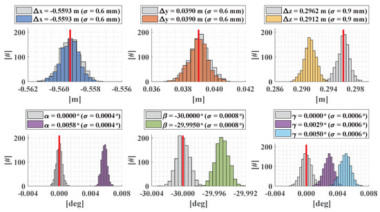 Inherently, the position and orientation observations of a mobile laser scanning system are prone to systematic errors due to the use of GNSS or uncorrected errors of the IMU. Therefore, we repeated the Monte Carlo simulation with additional biases of 5 mm and 0.005 for the position and orientation observations of the mobile laser scanning system. As in the case of random errors, we found that systematic errors of the position mainly affect the lever arm, while systematic errors of the orientation angles mainly affect the boresight angles. The results of the Monte Carlo simulation with both random and systematic observation errors are visualized as colored histograms in Figure 7.