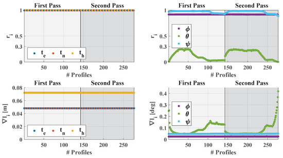 Clearly, the lever arm components and remain unbiased in the case of systematic observation errors (cf. Figure 7, top left, top middle). The lever arm components and mainly depend on the horizontal position and of the mobile laser scanning system. In the simulation, we found that the associated systematic errors and are completely transferred to the residuals of and and, thus, do not affect the parameters. This results from the repeated measurements of the plane setup with opposite direction of motion of the platform (cf. Figure 5, right). Basically, this kind of double measurement can be considered as a measurement in two faces, which is an established strategy in geodesy for the elimination of systematic errors [81]. For the height component, however, the systematic error is not eliminated in this way, which is why the lever arm component is biased by 5 mm (Figure 7, top right). For the elimination of a systematic height error , the mobile platform would need to measure the plane setup upside down in the second pass.
