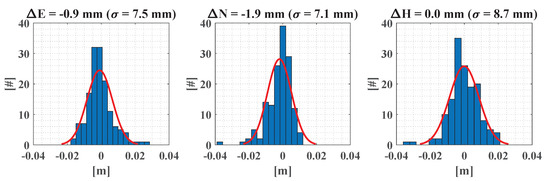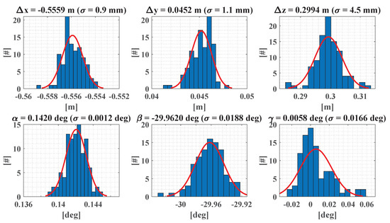 The grey histograms in Figure 7 show the distributions of the calibration parameters after the Monte Carlo simulation based on random observation errors only. The red vertical lines indicate the true calibration parameters, i.e., the expectation values. It can be stated that all parameters are unbiased if only random observation errors are simulated. For the three lever arm components, a standard deviation of < 1 mm is obtained. These results meet the defined target accuracies of 1 mm for and as well as 1.5 mm for (cf. Table 1). The accuracy of the lever arm mainly depends on the accuracy of the position of the mobile laser scanning system. The higher standard deviation of results from the higher standard deviation of the height component , which is assumed to be 1.5 times the standard deviation of the horizontal position and (cf. Table 1).