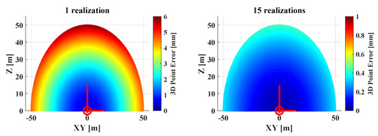 Figure 4 (left) visualizes the 3D point errors based on observation errors only (cf. Table 1, case (i)). In the close range, position errors are dominant with about 20 mm. Because of orientation errors, the uncertainty increases at higher distances. Figure 4 (right) shows the additional uncertainty of the point cloud when an uncertainty for the calibration parameters is added, i.e., (cf. Table 1, case (ii) – case (i)). A radially symmetrical pattern is visible. However, the additional uncertainty is < 1 mm within a radius of 50 m. We define this to be the goal of the calibration. Thus, given optimistic assumptions for the accuracy of the observations, the calibration parameters must be determined with a standard deviation of ≤ 1 ... 1.5 mm for the lever arm and ≤ 0.005 for the boresight angles (cf. Table 1, case (ii)).