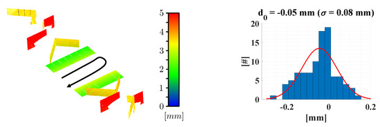 In addition to control points, area-based evaluation methods are widespread. In this respect, existing 3D city models can be utilized as a reference for evaluation [60,61,62]. Furthermore, reference point clouds (e.g., from TLS) are commonly used for evaluation (e.g., [10,11,18,21,33,63,64,65]), since software packages provide algorithms for the comparison of two point clouds. In this regard, it is also possible to mesh patches of the road surface that were measured multiple times with the mobile laser scanning system and compare these patches to each other [19,59]. Area-based evaluation methods supplement the point-based strategies, as mobile laser scanning is an area-based measuring technology. However, the interpretation of the differences of a mobile point cloud to a model or a reference point cloud is difficult due to the dependency on the structure of the measured object. For instance, height errors cannot be detected when driving parallel to a vertical wall.
