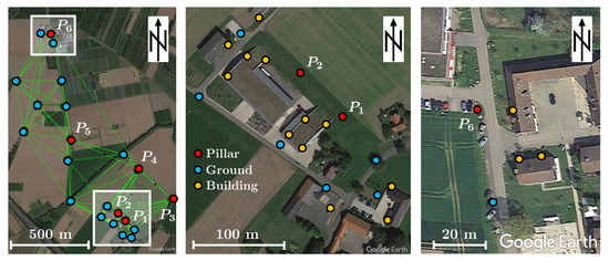 The literature review in Section 2.2 outlines common methods for the empirical evaluation of mobile laser scanning systems. Yet, these methods are not standardized [18] and facilities for the evaluation of mobile laser scanning systems are not available on a large scale [19,20,21]. This is why we decided to build up our own evaluation environment that implements existing evaluation strategies and combines them to a holistic approach. The evaluation environment consists of a dense network of control points as well as accurate reference point clouds of diverse building structures generated with TLS (Terrestrial Laser Scanning). Our evaluation environment allows for a point-based as well as area-based evaluation and can be used for arbitrary systems, independent of the specific setup. Beside the configuration analysis for the plane-based calibration approach and the realization of the calibration field, the installation of the evaluation environment is the second important contribution of this paper. Both the plane-based calibration field and the evaluation environment are permanently installed, readily accessible, and were utilized by our own mobile laser scanning system proving the operationality of our facilities.