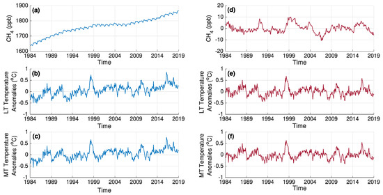 Time series of initial (a–c) and processed (d–f) global CH4 and temperature anomalies of the lower troposphere (LT) and mid-troposphere (MT).