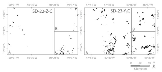 The study area is located between the states of Goiás (GO) and Minas Gerais (MG), in Brazil; more specifically, in the areas covered by grids SD-23-Y-C and SD-22-Z-C (Figure 1) of the Brazilian Continuous Cartographic Base at scale 1:250,000. Both grids are in the Cerrado biome. Each grid covers an area of 1.8 Mha, resulting in a total area close to 3.7 Mha. Goiás is the state with the second largest center pivot irrigated area (272,330 ha) in Brazil (18.4% of the total area irrigated by center pivot systems in Brazil) [8]. In 2017, the SD-23-Y-C grid had 37,285 ha, and the SD-22-Z-C grid had 7357 ha irrigated by center pivot systems, totaling 44,642 ha in both grids of the study area [8].