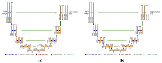 Original and modified U-net architectures (example for 32 × 32 pixels in the lowest resolution). Each blue box corresponds to a multi-channel feature map. The number of channels is denoted on top of the box. The x-y-size is provided at the lower left edge of the box. White boxes represent copied feature maps. The arrows denote the different operations. Based on Figure 1 from [21]. (a) Original U-Net architecture [21]; (b) Modified U-Net architecture