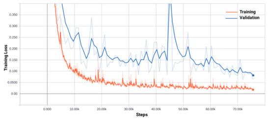The evolution of the training and validation errors of our model during the training process is shown in Figure 5. The training process took approximately 22 h to complete. The model’s loss showed great instability due to the size of our batch, which, due to computational limitations, was set to five. The use of a larger batch size would likely result in a more stable loss.