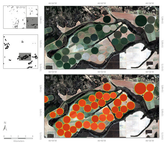 As the use center pivot irrigation systems is a growing trend, their accurate mapping is important for supporting a better management of available water resources. Center pivot irrigation systems form large circular patterns that can be easily seen from satellite images. Thanks to this, remote sensing has been widely used in the identification of areas irrigated by center pivot systems. In the 80s, Carlson et al. [9] described the use of Landsat 5 TM Band-3 images to monitor center pivot irrigation systems in the U.S. state of Nebraska from 1972 to 1986, identifying a growth from 2665 pivots in 1972 to 26,208 in 1986, a nearly ten-fold increase over 14 years. In Brazil, the National Water Agency of Brazil (ANA) [8] used images from medium spatial resolution satellites to perform a historical mapping of center pivot irrigation systems for different years, as far back as 1985.