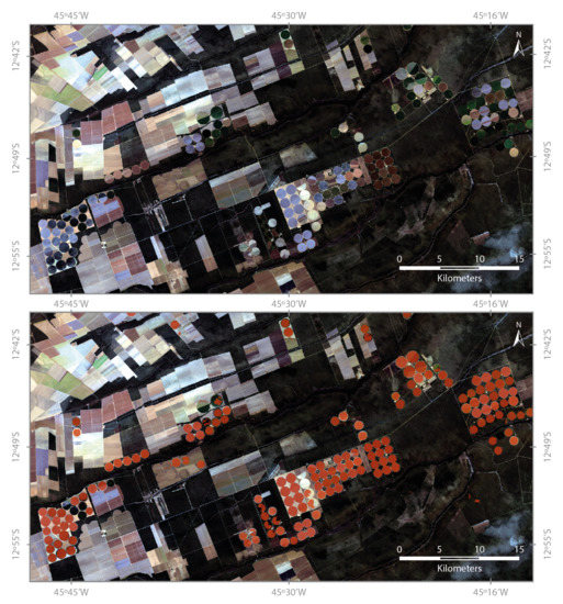 Figure 8 shows the results of the application of our model to a Landsat 8 OLI image. This image is in other location, with another sensor, spectral range, value scale, and spatial resolution, when compared to the data used to train the network. Despite this, our method was able to correctly segment most of the center pivot irrigation systems present in the image. This leads us to believe that our model was able to learn features that could be used to map center pivot irrigation systems in different regions. However, differences in land cover and crop characteristics, among other things, could lead to a significant reduction in segmentation performance in areas far from those used in the extraction of training samples. This could be fixed by retraining the network with samples extracted from regions with characteristics similar to those of the areas we wish to segment. We also believe that our methodology could be adapted to data captured with different sensors with minimal modifications to the network’s architecture.
