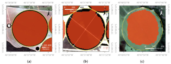 Examples of center pivot irrigation system segmentation using our approach. The yellow dotted lines show the position of center pivot irrigation systems in the reference data, and the results of the automatic mapping using our approach are shown in red. (a) Accurate segmentation mask; (b) Some pixels at the edge are left out; (c) Many pixels at the edge are incorrectly classified.