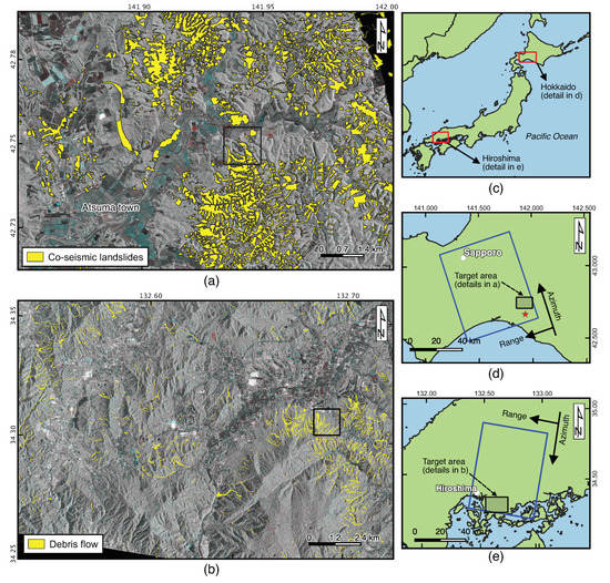 We select two target areas for testing our proposed methodology. Both study areas are located in Japan (Figure 1c). The first study area corresponds to the Hiroshima region, which was affected by large debris flows and flooding that were triggered by torrential rains. The second study area is located in the Hokkaido region (Figure 1c), where a relatively large earthquake triggered numerous landslides. In Figure 1d,e, the location of each target area is indicated by the dashed polygon.