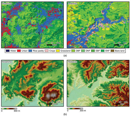Figure 2 shows the land cover and DEM data for both study areas. The predominant land cover corresponds to green spaces, which range from rice paddy fields to evergreen needle forests. In the case of Hiroshima, urban environments are concentrated mainly across the west side of the target area; however, the land elevation changes significantly from 0 m to 900 m. In the case of Hokkaido, the maximum land elevation is only approximately 300 m with a relatively planar area traversing the target area from the southwest to the northeast.