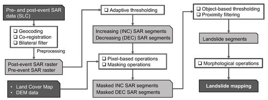 The proposed methodology integrates a series of pixel- and object-based operations to detect the landslides triggered by two different disasters by taking advantage of the damage-induced changes observed from PALSAR-2 images. The SAR backscattering intensity is strongly affected by the surface roughness, and different types of shapes and sizes of objects on the ground generate distinct features in SAR images. As a result, highly rough surface areas produce higher SAR intensities (brighter pixels), whereas darker areas indicate smooth surfaces or regions that SAR microwaves cannot reach (known as the shadow effect) [44,45].