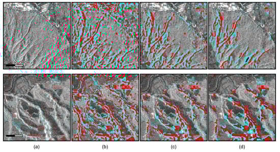 Next, to exclude isolated segments, we evaluate the spatial locations of and objects simultaneously. As discussed earlier, the landslide patterns in the SAR intensity images exhibit unique characteristics; that is, cyan and red segments appear next to each other with almost parallel orientations (Figure 3a). Our algorithm takes advantage of this feature by eliminating all pairs of and objects that do not satisfy this condition. We compute the vector distance between the centroids of and objects and classify the pairs of objects with a centroid distance of less than 70 pixels. After this operation, only the pairs with corresponding and segments are detected. The algorithms developed by Suzuki and Abe [58] that are implemented in the OpenCV-python library are used to carry out the abovementioned object-based operations on the masked images. Finally, a morphological closing filter with a 5 × 5 moving window is applied to fill holes in the segments.