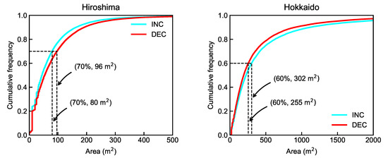 Cumulative frequency function of the segment size from each target area (INC: Increasing segments; DEC: Decreasing segments). The segments detected from the Hiroshima site are smaller than those from the Hokkaido site.