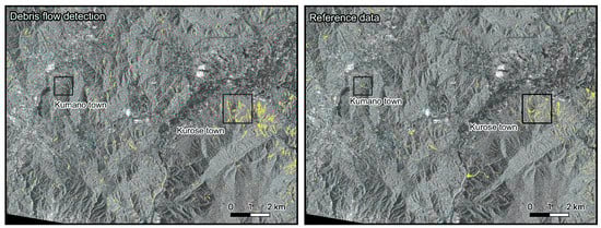 Table 2 describes the numerical evaluation of the prediction results. We employed a confusion matrix of debris flows and other areas by calculating the number of pixels corresponding to each class and transforming the units into km using the ground sampling distance of the SAR imagery (2.5 m). Furthermore, considering the unbalanced proportions of the two classes (debris flows and other), we also compute the kappa coefficient () to provide complementary information with which to evaluate the detection results.