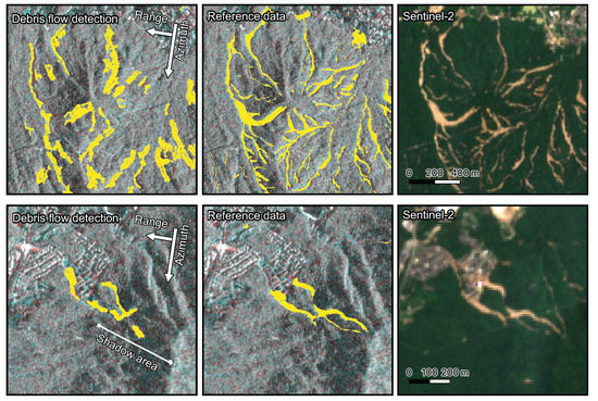The user and producer accuracies were 29.9% and 36.3%, respectively. Since the thicknesses of many detected segments are more significant than those in the reference data (Figure 9), the user accuracy was relatively low. However, the producer accuracy, which evaluates the ratio of relevant results correctly detected, was relatively high. Figure 9 shows the detection results of two locations with different SAR backscattering intensities and different orientation angle between the debris flow scars and the microwave direction (range direction). The area around Kamiboda in the town of Kurose (top panels), where most of the debris flow occurred almost perpendicular to the range direction, reflects an example of the overestimation of the detected segment thickness. On the other hand, our methodology accurately identified most of the scars produced by debris flows; however, segments that are not visible in the PALSAR-2 intensity images could not be detected due to the presence of speckle noise and the relatively low spatial resolution. The bottom panels show the area around the town of Kumano, where debris flows were effectively detected in downstream areas. However, the uphill regions are located in the SAR shadow zone, and thus, identifying debris flow segments therein is a very challenging task. One possible explanation is that the radiometric calibration, in the preprocessing stage, was conducted based on a local-incidence-angle algorithm using the SRTM 1 arcsecond data. While this approach is faster in terms of processing time, it is not accurate in the existence of topographic features such as mountainous areas. To overcome this issue, a more precise scattering area should be computed using a high-quality and high-resolution DEM data. This method (true-area algorithm) generates the most accurate SAR image in mountainous regions. However, this approach is significantly more computation expensive than the previous one [59,60]. Nevertheless, due to the adaptive threshold approach adopted in the proposed method, some damaged segments were accurately detected. Furthermore, taking into account that the debris flow orientations were almost parallel to the SAR range direction, the extracted segments also indicate that our algorithm is robust to different orientation angles between debris flows and microwave radiation. The accuracy metrics indicate that when used with only PALSAR-2 intensity images, our proposed methodology cannot precisely identify the dimensions of individual segments in the case of a debris flow disaster. However, the proposed methodology could perform better using SAR data with a higher spatial resolution acquired under different observation conditions. Considering that the total debris flow area covered only approximately 4.7% of the target area, the overall accuracy exceeded 98%. Furthermore, the computed -coefficient (0.32) indicates that the proposed methodology could still be used for detecting potential debris flow locations during the early stages of disaster response scenarios.