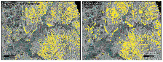 We also tested our proposed methodology on the detection of the coseismic landslide triggered by the 2018 Hokkaido earthquake. Figure 10 shows the detection results (left panel) and the GSI reference data (right panel). The spatial distribution of the extracted landslide segments is excellently correlated with the reference data. Most of the landslides were consistently detected on the eastern side of the target area. In terms of the segment size, the obtained results also agree well with the interpreted reference data. According to the reference data, the total damage area, including the areas of surface rupture and deposition, was approximately 24.3 km, and the ratio between the landslide area and the total area was approximately 30%. The detection results yielded a total damage area of approximately 21 km, indicating a slight underestimation. This fact is derived from the same logic as that at the Hiroshima site; that is, the proposed methodology does not include debris deposited at the base of mountainous terrain because of the land cover-based masking operations.