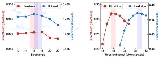 Analysis of optimal values for slope angle (left panel), and kernel size for adaptive thresholding that used in the proposed framework. The vertical frames show the range of recommended values for detecting landslides using ALOS-2 intensity images.