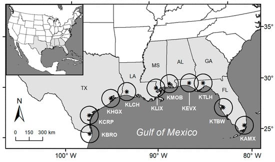 We used archived Level II NEXRAD data from the National Oceanic and Atmospheric Administration to calculate bird stopover density during the peak of spring migration (1 March to 31 May [46]). The data were collected during 2008–2015 from 7.5 km to 100 km around ten weather radars across the United States coast of the GOM (Figure 1). Weather radars measure reflectivity (i.e., a volumetric measure of migrant density) and radial velocity (i.e., a measure of the inbound or outbound radial speeds relative to the radar) within individual radar sample volumes that are 250 m in range and 0.5° in width, scanning the air with 360° sweeps of the beam at multiple elevation angles in 5–10 min intervals. Because nocturnally migrating birds generally depart en masse near civil twilight [49], we visually screened the lowest elevation (0.5° angle) radar scans from 30 minutes before sunset to an hour after sunset and eliminated periods of migratory departure that contained potential sources of contamination (e.g., precipitation, clutter, anomalous propagation of the radar beam). Following McLaren et al. [55], we used animal airspeeds, derived by integrating radial velocity and North American Regional Reanalysis wind measurements [56], to also eliminate sampling periods of migratory departure containing biological reflectivity dominated by organisms other than birds. Specifically, we discarded sampling periods with mean animal airspeeds of less than 5 m s−1 because we considered them dominated by insects [57,58]. Of the 736 calendar days considered during the 2008–2015 study period, we kept an average of 120 radar−1 for analysis. We also excluded any individual sample volume that experienced more than 25% topographic blockage of the radar beam or reflectivity from persistent ground clutter, or were located over open water or Mexican free-tailed bat (Tadarida brasiliensis) roosts [49].