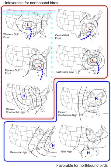We considered synoptic weather types to be favorable or unfavorable for northward migration based on frontal activity and wind direction, such that unfavorable weather types were associated with either heavy precipitation or headwinds. We considered five synoptic weather types to be unfavorable: (1) Western Gulf Fronts, characterized by a cold front over the western GOM; (2) Central Gulf Fronts, characterized by a cold front in the central GOM; (3) Eastern Gulf Fronts, characterized by a cold front over the eastern GOM; (4) East Coast Lows, characterized by a low-pressure system east of the Mississippi River and a cold front that has entered the Atlantic Ocean; and (5) Midwest Continental Highs, characterized by a high-pressure system between the Mississippi River and Rocky Mountains. Precipitation accompanies the frontal systems of Western, Central, and Eastern Gulf Fronts and East Coast Lows. During East Coast Lows and Midwest Continental Highs, winds are blowing from the north, particularly within the western GOM coastal region. Three synoptic weather types were considered favorable for northward migration: (6) Eastern Continental Highs, characterized by a high-pressure system between the Mississippi River and the Atlantic Coast; (7) Bermuda Highs, characterized by a high-pressure system over the western Atlantic Ocean; and (8) Gulf Highs, characterized by high pressure centered over the GOM and usually associated with slow to nonexistent winds. The three favorable synoptic weather types can support northward migration within the western GOM coastal region, with winds blowing from the south.