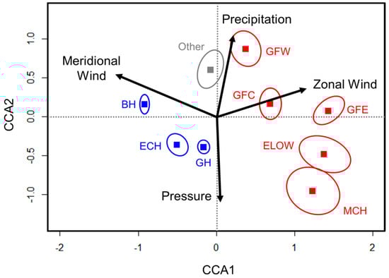 Canonical correspondence analysis plot showing the mean canonical variate values of the nine daily synoptic weather types and the canonical vectors of four continuous weather variables measured throughout the night over the Gulf of Mexico including zonal (blowing east or west) and meridional (blowing north or south) wind speeds (m s−1) at 925 mb, surface air pressure (kPa), and accumulated total precipitation (kg m−2) from North American Regional Reanalysis points over the Gulf of Mexico relative to the first two canonical axes (CCA1 & CCA2). The zonal wind component estimates wind speed in the east–west direction (positive if blowing towards the east and negative if blowing towards the west), and the meridional wind component estimates wind speed in the north–south direction (positive if blowing towards the north and negative if blowing towards the south). All measurements were taken at 6:00 UTC the night prior to migrants departing stopover sites. Ellipses denote the 95% confidence intervals of means for the synoptic weather types, which include five unfavorable for northward migration (e.g., winds blowing south and/or moderate to high amounts of precipitation) in red: Western Gulf Front (GFW), Central Gulf Front (GFC), Eastern Gulf Front (GFE), East Coast Low (ELOW), and Midwest Continental High (MCH); and three favorable for northwards migration (e.g., winds blowing north and little to no precipitation) in blue: Eastern Continental High (ECH), Bermuda High (BH), and Gulf High (GH). The last synoptic weather type of “Other” consisted of a subset of instances that did not fit into one of the eight prior categories.
