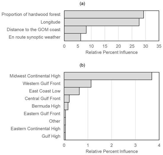 The model (63.2% deviance explained; see Table S3 and Figure S1 in Supplementary Materials) indicated that en route synoptic weather (i.e., encountered during migration over the GOM the previous night) influenced mean VIR (i.e., density of landbirds departing stopover sites) along the northern GOM coast to a small degree, with a cumulative relative influence of 6.0% (Figure 4a). En route synoptic weather was nearly as influential as distance from the GOM coast (8.1%) but less influential than the amount of hardwood forest in the landscape (29.3%) or longitude (27.7%).