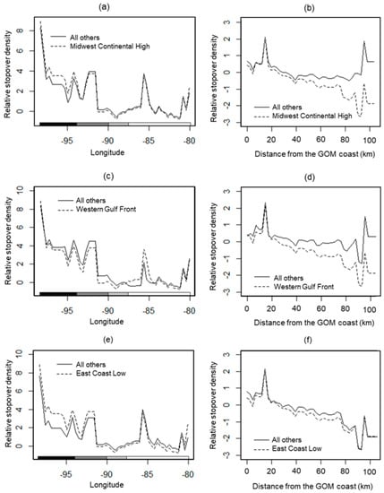 Plots of interactions among longitude (a,c,e) and distance from the Gulf of Mexico (GOM) coast (b,d,f) and the three most influential en route synoptic weather types (a,b: Midwest Continental High; c,d: Western Gulf Front; e,f: East Coast Low) from a boosted regression tree model predicting mean bird stopover density within the northern GOM coastal region. The solid line represents the combined response of all the other synoptic weather types. The shaded bars underneath the longitude interactions indicate the state, with Texas on the far left, followed by Louisiana, Mississippi/Alabama, and Florida.