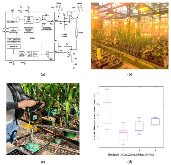 (a) Schematic diagram of EVAL-AD5933EBZ evaluation board [28]; (b) plants in the Agriculture and Agri-Food Canada (AAFC) greenhouse; (c) impedance measurement of plant leaves using electrical impedance spectroscopy (EIS); and (d) boxplots of actual nitrogen concentrations, measured by the laboratory experiments, for four different plant species.