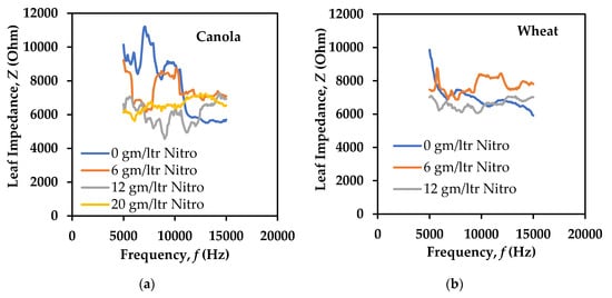 Plots of frequency versus leaf impedance. (a) canola; (b) wheat; (c) soybeans; and (d) corn at different nitrogen fertilization levels. The impedance profile for a few samples of wheat and soybeans could not be taken because of the effects of high nitrogen fertilization.