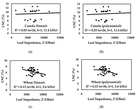 Correlations between leaf impedance and leaf nitrogen concentration (LNC) for four different plant species. The coefficient of determination (R2) is extracted for canola (a) linear 0.03; (b) polynomial 0.03; for wheat (c) linear 0.13; (d) polynomial 0.15; for soybeans (e) linear 0.08; (f) polynomial 0.11; and for corn (g) linear 0.18; (h) polynomial 0.19.