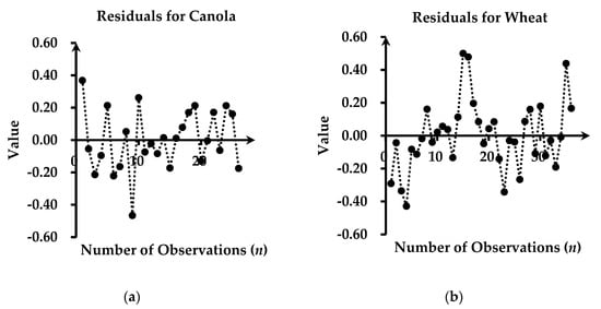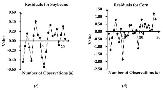 Residuals in different number of observations for (a) canola; (b) wheat; (c) soybeans; and (d) corn with nitrogen concentrations.