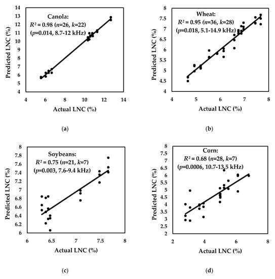 A maximum correlation coefficient of 0.99 is obtained for canola, using multiple features ranging from 8.7 to 12 kHz. The maximum coefficient of determination for canola is 0.98, the adjusted R2 is 0.94, RMSE is 0.54%, and the ANOVA tests are positive; here, SSR = 133.58, SSE = 0.87, SST = 134.46, and p-value = 0.014 (F-test). From 101 features, only 22 were selected to obtain the best correlation and regression results using ANOVA tests. Overfitting was reduced by the backward elimination of features with p-values greater than the threshold. The chances of overfitting could also be reduced by minimizing the features to 10 or nine, which would also reduce the corresponding correlation coefficient to 0.85 or 0.78, respectively. On the basis of the maximum correlation, the proposed model for the predicted nitrogen concentrations in canola for multiple features is extracted as: