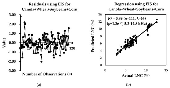 Plots of (a) number of observations versus value of residuals; and (b) actual versus predicted LNC for canola + wheat + soybeans + corn using EIS. The extracted coefficient of determination (R2) is 0.89 and the corresponding overall correlation coefficient (R) is 0.94.