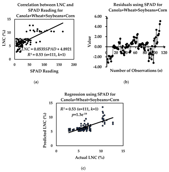 Plots of (a) soil-plant analyses development (SPAD) reading versus LNC; (b) number of observations versus value of residuals; and (c) actual LNC versus predicted LNC for canola+wheat+soybeans+corn using SPAD. The extracted coefficient of determination (R2) is 0.53 and the corresponding overall correlation coefficient (R) is 0.72.