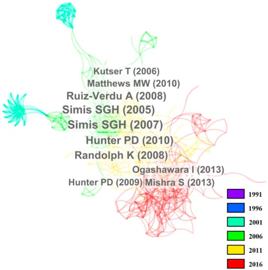 - Chen, C. Searching for intellectual turning points: Progressive knowledge domain visualization. Proc. Natl. Acad. Sci. USA 2004, 101, 5303–5310. [Google Scholar] [CrossRef]