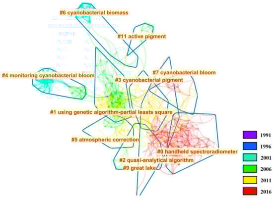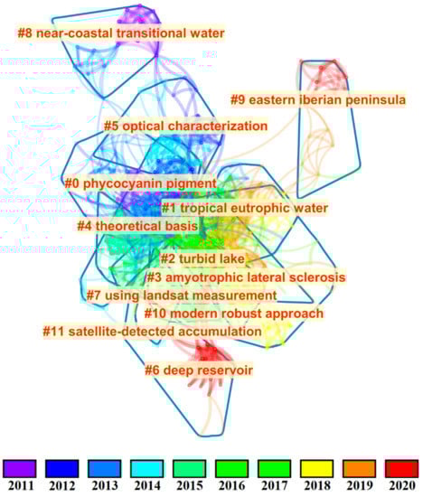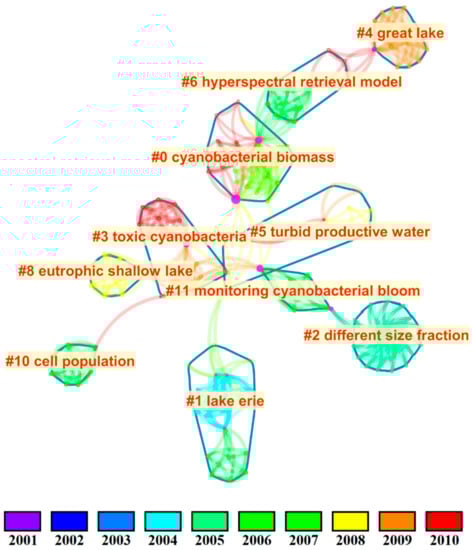 11 | active pigment (22.35, 10−4); turbid productive water (22.35, 10−4); mesotrophic reservoir (13.61, 0.001); predicting phycocyanin concentration (9.45, 0.005); novel algorithm (9.45, 0.005); | cyanobacteria; predicting phycocyanin concentrations; novel algorithm; proximal hyperspectral remote sensing approach; mesotrophic reservoir; phycocyanin; turbid productive water; chlorophyll; chlorophyll-a | phycocyanin; turbid productive water; chlorophyll; proximal hyperspectral remote sensing approach; predicting phycocyanin concentrations; chlorophyll-a; mesotrophic reservoir; cyanobacteria; novel algorithm |
