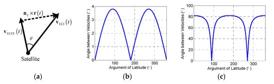 The formula of the angle between and , , in the case of small eccentricity, will be derived in the next sub-section, with the result shown in (11). Here we present the result in LEO SAR and GEO SAR in advance in Figure 3 to show the impacts of the Erath’s rotation on the baseline calculation. The orbital elements are shown in Table 1, where the orbital elements of LEO SAR are similar to that of TerraSAR-X. Supposing a formation without an along-track baseline (suitable for InSAR application) in the ECI coordinate system has the perpendicular baseline of , the relative baseline error caused by the Earth’s rotation is . For LEO SAR, the angle between the directions of and is not more than 4°, whose corresponding relative baseline error is 0.24%. However, in GEO SAR, the angle can reach 80°, whose corresponding relative baseline error is 82.6%, which will lead to the conversion of the along-track baseline to the cross-track baseline and vice versa. Therefore, in GEO SAR, the baseline component cannot be calculated accurately with .