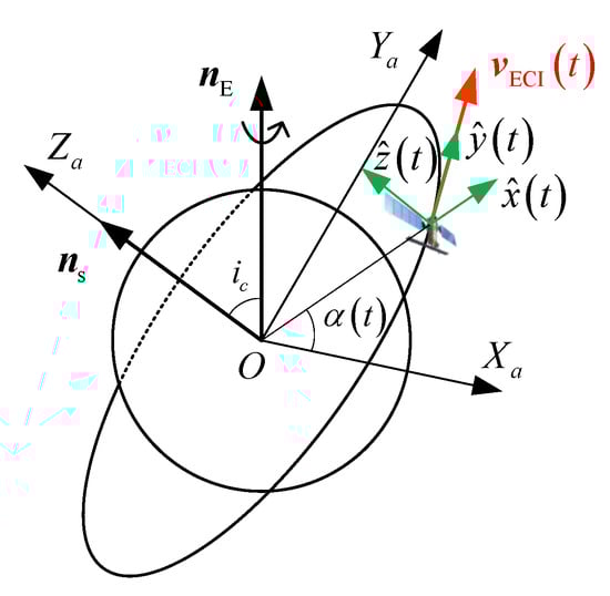 Formula (5) can be calculated by establishing an auxiliary coordinate system, , shown in Figure 4. The subscript a stands for auxiliary. passes through the satellite ascending node, pointing to the highest point of the orbit, and being in the same direction as the angular velocity of the orbit. and are the angular velocities of the satellite and the Earth, respectively. is the orbital inclination of the master satellite.
