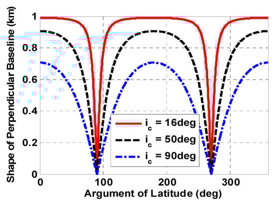 It should be noted that the shape of the perpendicular baseline in the whole orbit, denoted as , is independent of the orbit elements of the slave satellite, but only related to the inclination of the master satellite. The sum of RAAN difference and AOP difference , , only affect the amplitude of the perpendicular baseline. Figure 5 shows the shape of the perpendicular baseline in the whole orbit, where 3 inclinations are selected. However, the relationship between along-track baseline and orbit elements difference and is much more complicated, shown as (17).