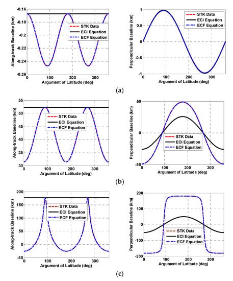 Baseline calculated using ECF equation, ECI equation, and STK data. (a) LEO SAR formation; (b) MEO SAR formation; (c) GEO SAR formation.