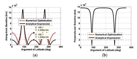 Baseline comparison of numerical optimization and proposed analytical expression for GEO InSAR. (a) Along-track baseline; (b) Perpendicular baseline.