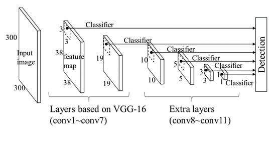 The SSD architecture is shown in Figure 1. The network is based on VGG-16, which is a commonly applied architecture proposed by the visual geometry group (VGG) [44]. SSD detects objects based on default boxes that are set at every pixel position in feature maps. Default boxes at one position comprise a square and rectangles of several different aspect ratios, and they are sized according to default box sizes that define the object sizes to be detected. A default box size is determined for each feature map independently. SSD detects objects through convoluting a local 3 × 3 patch at every pixel position of each feature map and predicting object locations expressed by differences from default boxes (offset and scale) and class confidences. In training, default boxes that have overlaps called IoUs (intersection over unions) with bounding boxes of ground truth objects over a specified threshold are regarded as positive examples, and those whose overlaps are under the threshold are regarded as negative examples. We adopted the threshold value of the original paper (0.5), which is a commonly used neutral value.