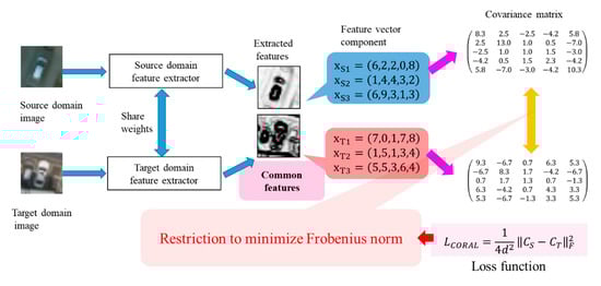 where denotes the squared matrix Frobenius norm, d is a dimension of an example, and and are covariance matrices of the source and target examples (extracted features), respectively. Covariance matrices are calculated from examples in each iteration by the following formulations: