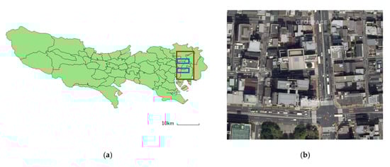 Study area in Japan. (a) Map of Tokyo. The red rectangle outlines the study area for which aerial images were obtained. We extracted non-labeled training images for DA from the area outlined by the blue rectangles and labeled training and test images from the area outlined by the red rectangle (excluding the blue rectangles) where the latter images were manually annotated. (b) An example image.