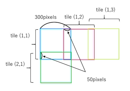 When we tested images larger than the SSD input size (300 × 300 pixels), we separated the input images into 300 × 300 pixel tiles, allowing them to overlap with each other by 50 pixels (Figure 6) and conducted vehicle detection in every tile. Then, we aggregated the detection result of every tile and eliminated redundant detections by non-maximum-suppression (NMS) with an IoU threshold of 0.45, which is the same as the original SSD.